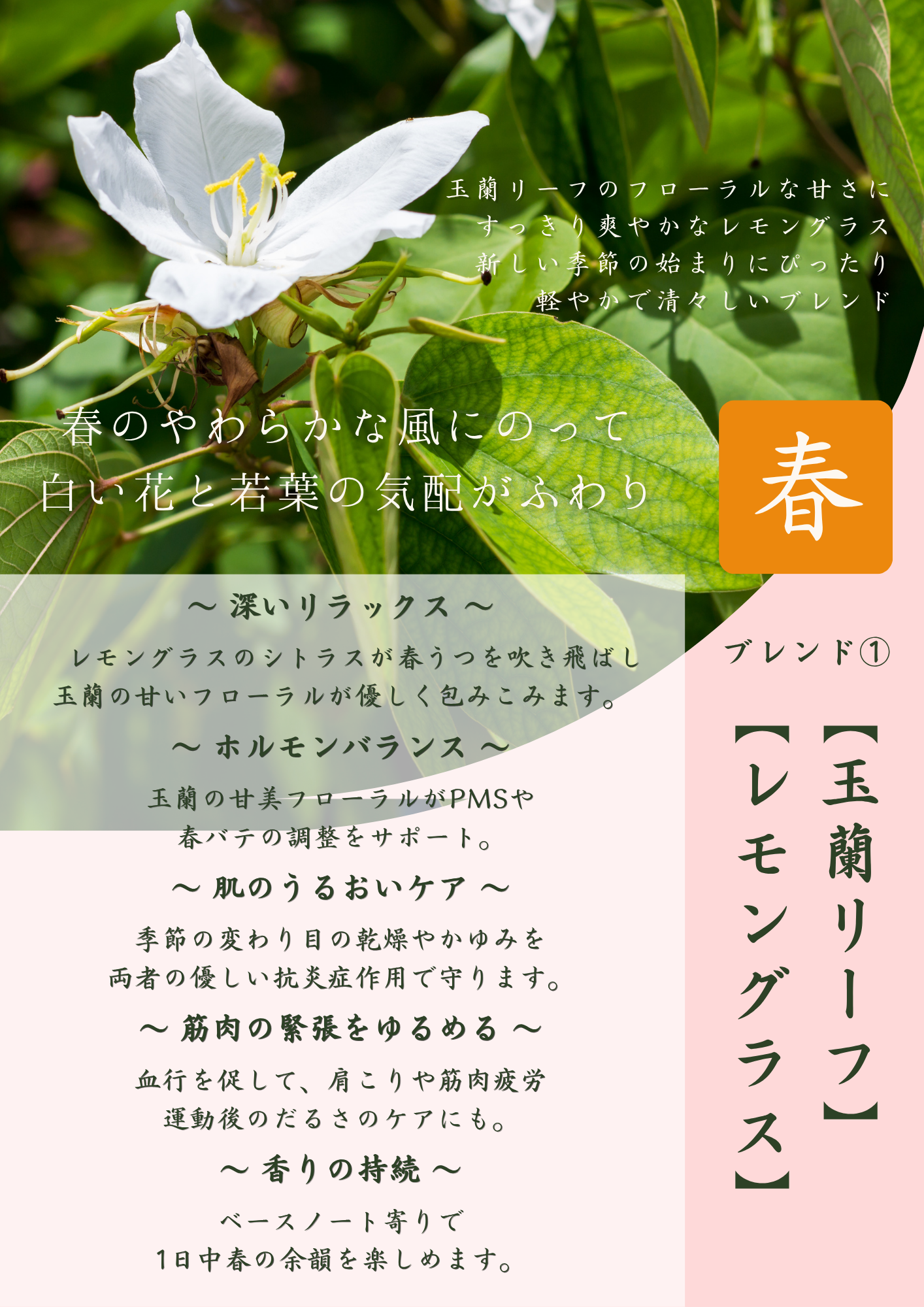 - 玉蘭リーフ:フローラルとハーブが共存した希少精油。リナロール豊富